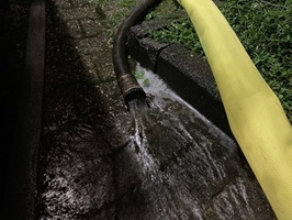 Dann kam die Feuerwehr mit zwei Einsatzfahrzeugen und sie setzten mehrere Pumpen ein, inklusive der einen von Steinpflege Rheinland. Gegen 24 Uhr gab es einen Stromausfall und die Feuerwehr musste ein Notstromaggregat einsetzen. Die Situation zog sich in eine unermessliche Länge. Herr Rinke blieb bis 3 Uhr morgens und leistete Unterstützung; die Pumpe ließ er zurück, damit diese am nächsten Tag weiter benutzt werden konnte.