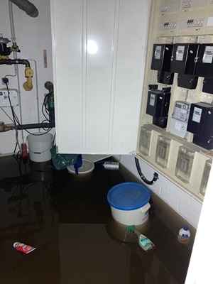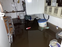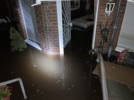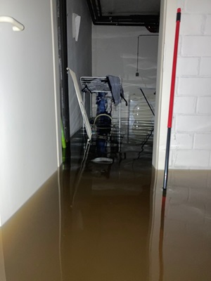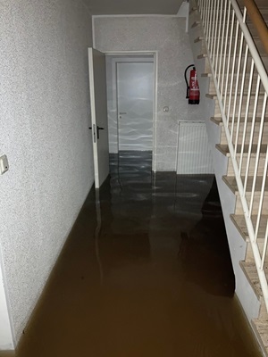 Die Wasserhöhe im Wohnraum stieg bis ca. 90 cm, dann füllten sich auch die Kellerräume (bis 50 cm) und eine zweite Unterschosswohnung war nun ebenso betroffen.