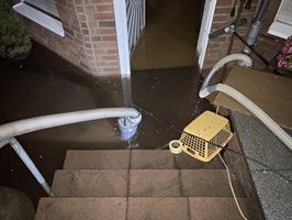 Bereits ab ca. 18 Uhr wandten wir uns an die Feuerwehr und gleichzeitig auch an Steinpflege Rheinland, um Hilfe zu erhalten. Die Feuerwehr erschien jedoch erst gegen 23 Uhr. Thomas Rinke (von Steinpflege Rheinland) hingegen gelangte schon um 19 Uhr zu uns und brachte eine professionelle Pumpe mit, um gegen das Wasser ankämpfen zu können. Wir Anwohner versuchten also mit Hilfe von Thomas Rinke und der Pumpe den enormen Wasserfluss zu stoppen. Die Wassermassen waren aber viel zu groß. Obwohl Thomas Rinke zumindest dafür sorgen konnte, dass das Wasser, welches reinfloss, wieder rausbefördert wurde.