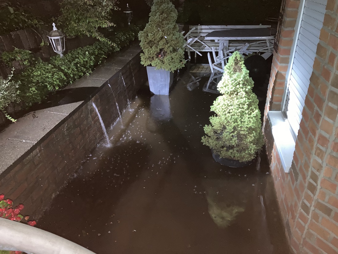 Am Mittwoch, den 14.07.2021, traf es uns völlig unvorbereitet. Es war später Nachmittag, als Grundwasser, das bereits bis zur Rasenoberfläche reichte, die Terrasse der Souterrainwohnung füllte.